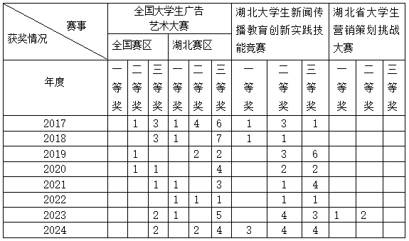 高水平的学科竞赛不仅是学生展现才华的舞台,更是学院深化教学改革、推动教育创新的生动实践。近年来,人文与传媒学院秉持“以赛促学、以赛促教”的教学理念,将全国大学生广告艺术大赛、湖北大学生新闻传播教育创新实践技能竞赛及湖北省大学生营销策划挑战赛等赛事深度融入日常教学,取得了显著成效,结出了累累硕果。