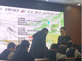 接下来是梁传书老师带领九(4)班的同学进行《诗歌反复手法的品读与借鉴》群文阅读课堂展示。梁老师以“风姿绰约的‘反复’”为题进行课堂展示,让学生从多张图片的观察引入“反复”手法的运用,从《野望》和《乡愁》两首诗歌带领学生体会反复的形式和反复的效果,让学生以反复手法自主创作诗歌,体验做诗人的滋味。最后以对同学的期望——“希望同学们发现美,找到美,用自身的聪慧表现美”来作为课堂的结尾。四十分钟流畅而新颖的课堂设计令人感到酣畅淋漓,回味无穷。