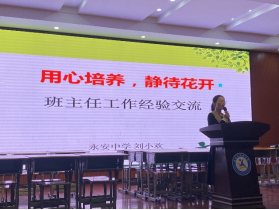 主持人黄莹代表永安中学对同学们的到来表达了热烈的欢迎。刘小欢老师做了主题为班主任工作的讲座,刘老师从“用爱心浇灌花朵”、“用智慧管理班级”、“用活动促进成长”、“用学习成就你我”四个方面概括了自己作为班主任的工作经验。她详细地讲述了如何开展班主任工作,在分享对工作独到理解的同时,也帮助同学们充分了解班主任工作,引发了同学们对班主任工作的深入思考,初步培养了同学们的班级管理能力。刘老师的分享结束后,黄副校长就学生们心中对班主任工作的疑问进行了解答。黄副校长最后的“立责于心,履责于心”的寄语也代表对同学们未来成为优秀班主任的殷切期望。