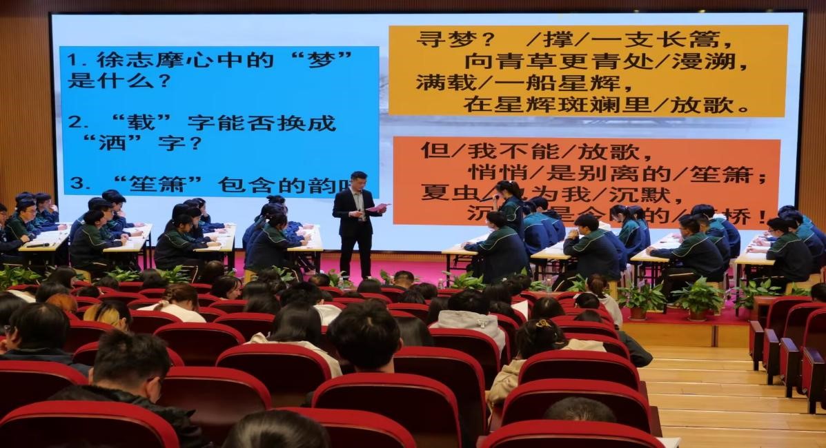 活动伊始,赤壁市教育局副局长饶邦才致辞。随后,慧晟实验中学的黎珍老师以一首《再别康桥》的诗歌朗诵导入了一堂充满激情与感染力的课。黎老师循循善诱,引导学生细细品读诗歌意蕴,凸显其文学造诣与诗人气质。下课时,台下的青盟教师和学子们纷纷报以热烈的掌声。
