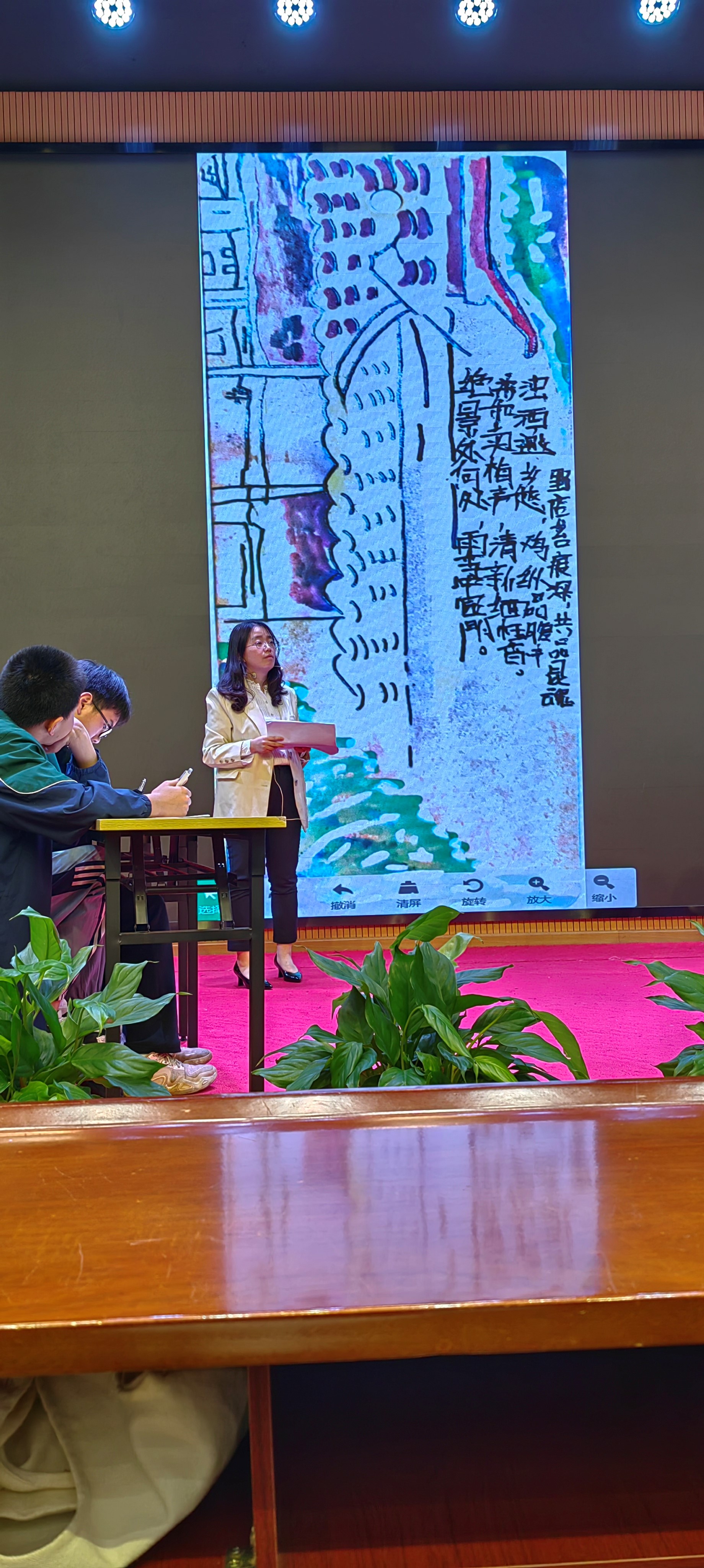接着,李洁老师以《昆明的雨》为题,讲授了一堂别开生面的课。她的授课方式深入浅出,贴近生活实际。以“如何描绘赤壁”为引,引领学生进入课堂的学习。她鼓励同学们发挥想象力,选取心中关于昆明雨季的场景进行绘画,并附上一首小诗或句子以表达感受。同学们在思考和创作中,不断迸发出新的思维火花,课堂氛围十分热烈。