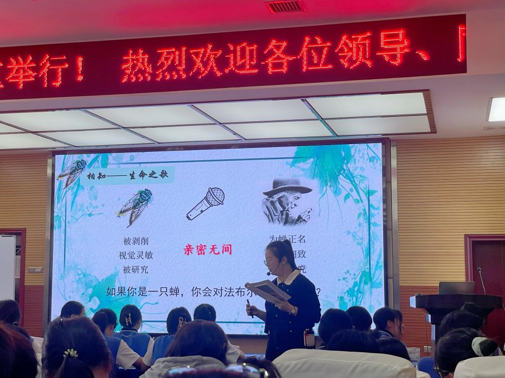 第一节课是由来自赤壁市实验中学祝嫣婷老师带来的《蝉》的教学展示。她通过一段蝉鸣声导入新课,这种新颖的导入方式吸引了学生的兴趣,从而更好的开展课文的讲授。接着,祝老师让同学们为蝉制作一张名片,从蝉的别名、生活习性、蝉壳、蝉的生命简史方面进行制作,通过这种方式来探寻蝉的身世之谜。在与蝉相遇后,我们进入到了相识阶段,老师让同学们通过故事性、生动性、哲理性三个方面来探究本文语言的奥秘,同时也把法布尔描绘蝉的语言与百度百科上的语言进行对比分析,从而让学生领会到文艺性说明文与科普性说明文的不同之处,更好的感受法布尔笔下昆虫的魅力。从相识再到相知,老师为学生提供了三则材料补充,让同学们进一步知晓蝉,了解蝉的更多信息,从而更好理解法布尔笔下的蝉。整个过程中祝老师灵活运用多媒体进行教学,如音频、视频、图像,教学手段多样,使课堂更加充实有趣,最后祝老师将蝉的生长过程与人生进行类比,鼓励同学积极面对困难,描绘出丰富精彩的人生,深化主题,升华主旨。