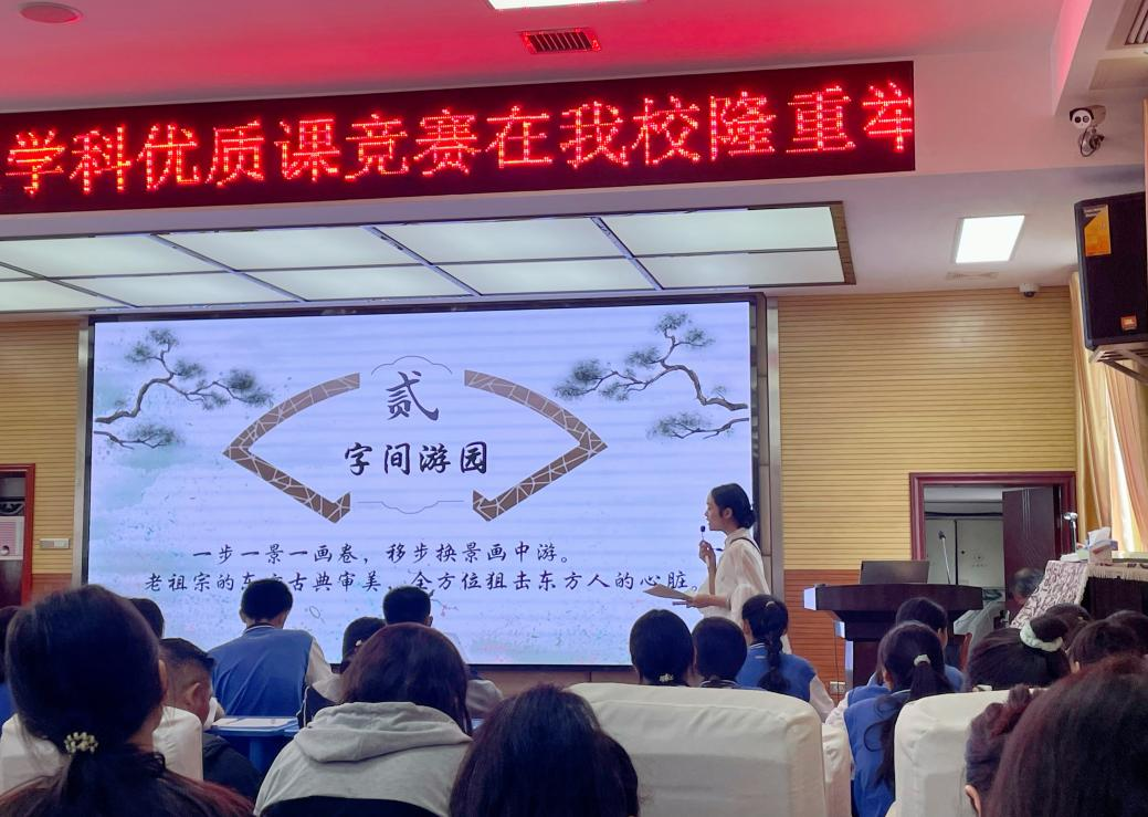 第二节课是由来自神山中学吴梦洁老师带来的《苏州园林》的教学展示。吴老师在课堂开始时提到了一句话“江南园林甲天下,苏州园林甲江南”,从而引入课题。她从“大观园”“字间游园”“写尽烟雨江南”三个方面展开教学。首先通过让学生找出最能概括苏州园林整体特征的句子,接着按观园顺序,标出观园之景,进行整体感知。第二部分,通过分析句子的说明方法来让学生沉浸式体验苏州园林的东方美,并进行小组讨论分析。最后,通过自主写作的方式,来更好感悟苏州园林的魅力,吴老师通过补充填写句子和为朋友圈写文案的方式让同学们进行写作,教学方法多样,手段新颖,不仅锻炼了学生的写作能力,也激发了学生们的学习热情,课堂效果好。