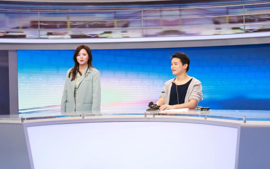 在李艺洋老师的带领下,同学们首先踏入二号演播厅。面对专业的提词器、多机位切换台和聚光灯,课堂上的理论瞬间变得具体可感。李艺洋老师详细拆解了站播与坐播在语速控制、肢体语言上的细微差别。两名同学主动上台体验出镜播报,真实感受了一次新闻录制现场。有同学坦言,面对镜头和滚动的提词器,既要保证播报流畅自然,又要兼顾神态与体态,远比看上去更考验心理素质和专业功底,也真切体会到了新闻主播台前幕后的不易。