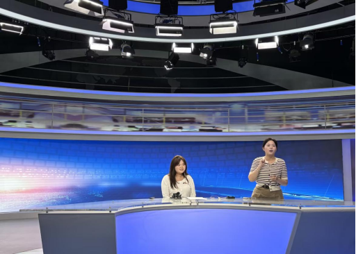 同学们首先来到2号演播厅,这里是《咸宁新闻》主持人出镜、新闻导播、人物专访及固定栏目的核心制作场地,流程规范、标准严谨。工作人员详细介绍了演播厅内的专业设备,包括提词器、摄像机、耳返、耳麦等,讲解了各类设备在新闻播报中的功能与配合方式,结合《咸宁新闻》片头、主持人开场导播等实际环节,完整展示了电视新闻出镜录制的专业流程,让大家直观感受新闻录制的规范化操作。