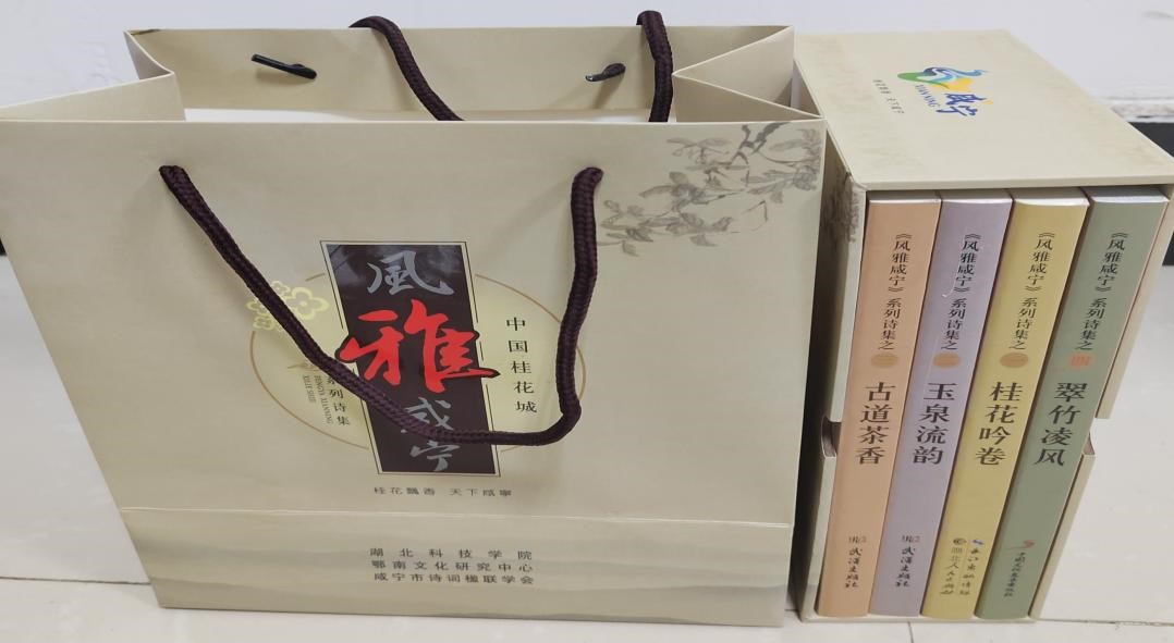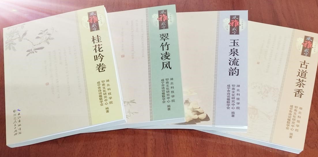 咸宁是全国著名的“桂花之乡”“茶叶之乡”“温泉之乡”和“楠竹之乡”。为了助力咸宁“中国桂花城”建设,提升香城泉都的知名度;为了弘扬中华诗词文化,挖掘、传播鄂南特色文化,增加咸宁的美誉度,为咸宁经济建设服务,应咸宁市诗词楹联学会的倡议,williamhill英国鄂南文化研究中心与咸宁市诗词楹联学会联袂将单行本的《桂花吟卷》《玉泉流韵》《古道茶香》《翠竹凌风》四部诗集加以修改、补充与完善,形成套装精品——《风雅咸宁》,纳入“鄂南文化研究系列丛书”之中,全新亮相。这套丛书由鄂南文化研究中心策划和资助出版、院长郭彧担任副主编(副主任),我校部分教师和学生曾参与其编撰过程。