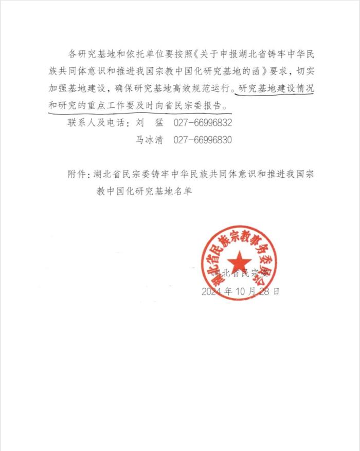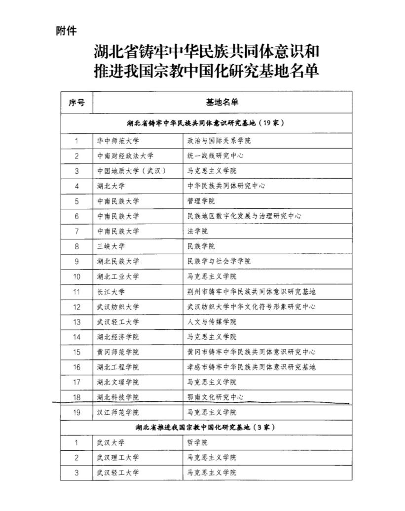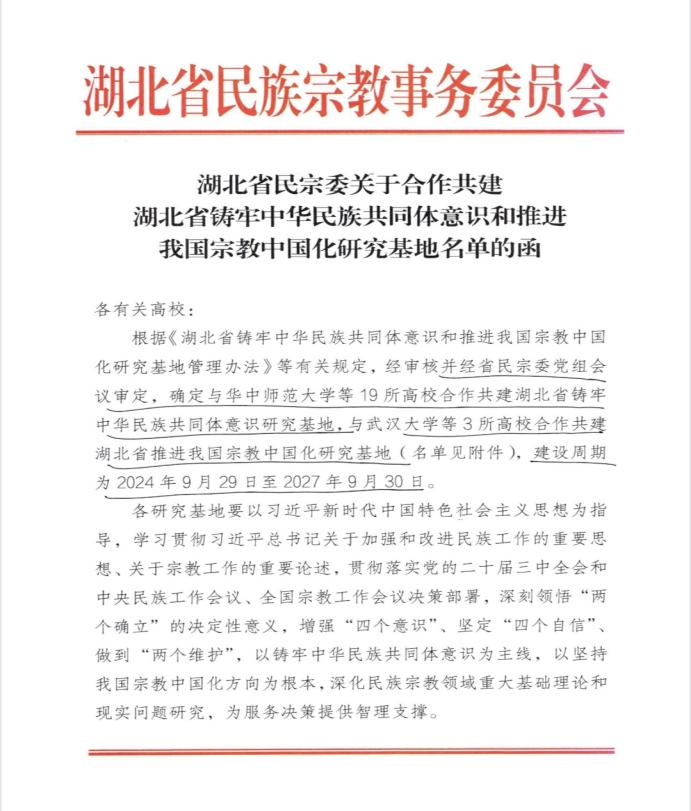 根据《湖北省铸牢中华民族共同体意识和推进我国宗教中国化研究基地管理办法》等有关规定,经审核并经省民宗委党组会议审定,我校鄂南文化研究中心再次获得一个省级平台“湖北省铸牢中华民族共同体意识研究基地”。建设周期为2024年9月29日至2027年9月30日。