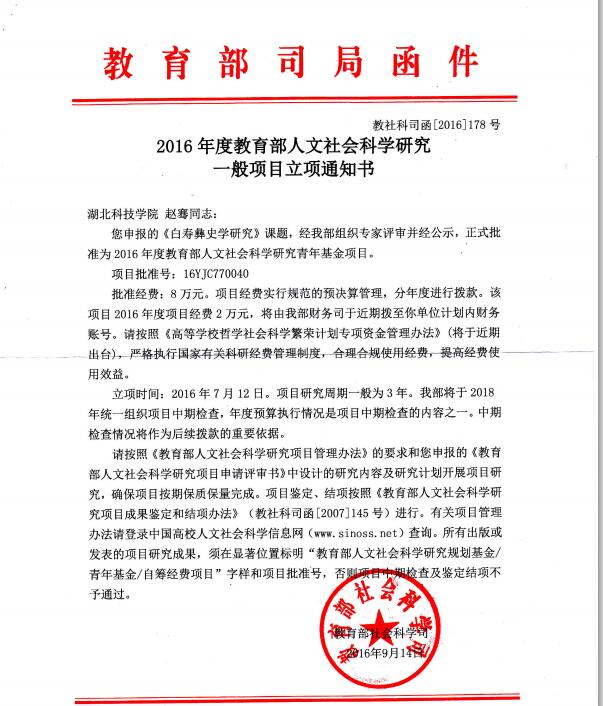 本网讯 接国家教育部(教社科司函[2016]178号)文件,我院赵骞博士申报的《白寿彝史学研究》课题已正式批准为2016年度教育部人文社会科学研究青年基金项目;项目批准号:16YJCT70040 ,批准经费:8万元。