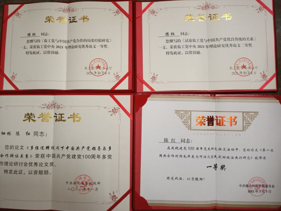 2021年是文传学院陈红老师科研丰收年。陈老师撰写的《农工党与中国共产党合作的历史经验研究》《试论农工党与中国共产党优良传统的关系》两篇文章分获农工党中央办公厅颁发的农工党中央2021年理论研究优秀论文一等奖和二等奖;陈老师与咸宁市委常委、统战部长梁细林合撰的《多维逻辑视域下中国共产党领导与多党合作辩证关系》获湖北省统战部颁发的中国共产党建党100周年多党合作理论研讨会优秀论文奖。另外,今年7月陈老师撰写的《第一次国共合作时期毛泽东与邓演达农民运动政治共识研究》被评为中共williamhill英国委员会庆祝建党100周年党史研究征文一等奖。