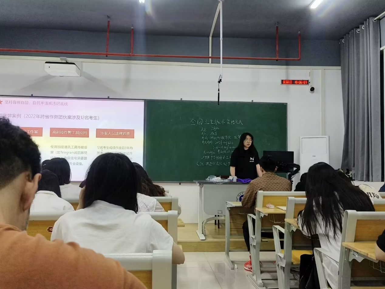 在考试不诚信警示案例环节,班会列举多起典型案例。2022年跨省作弊团伙案,该团伙在3省设立据点,运用高科技作弊工具,组织12名考生协同作弊。最终,涉案人员均受到法律严惩,12名考生成绩作废且3年内禁考,主犯获刑2年6个月并处罚金15万元。2024年的替考事件中,雇佣枪手代考的考生与枪手均被刑事拘留、取消考试资格并面临禁考处罚,参与替考的高校学生还被开除学籍,职业规划受阻。2023年某省考生使用改装智能眼镜作弊,同样被禁考3年,相关科目成绩作废,升学资格也受到影响。