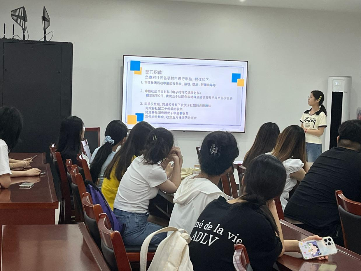 会议首先由社团管理部进行工作汇报,介绍部门工作概况以及部门职能等,强调对社团各项材料进行审核的具体流程。同时明确各部门工作安排,包括社团活动申报流程、社团活动宣传及新闻稿的具体要求、社团经费报销和社团评审等多方面的内容,为各社团的工作提供了标准示例。