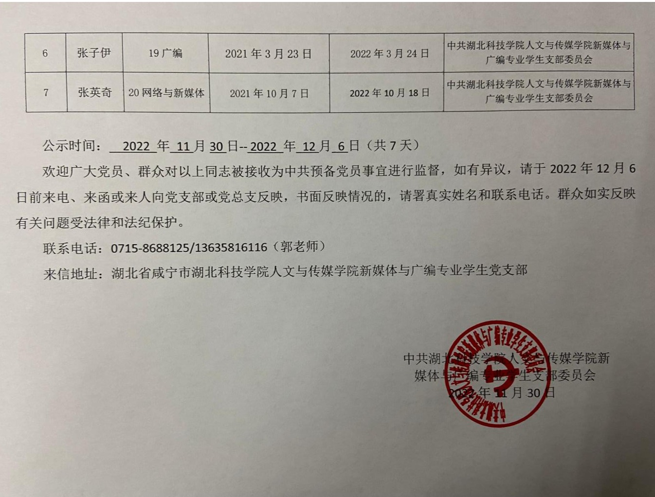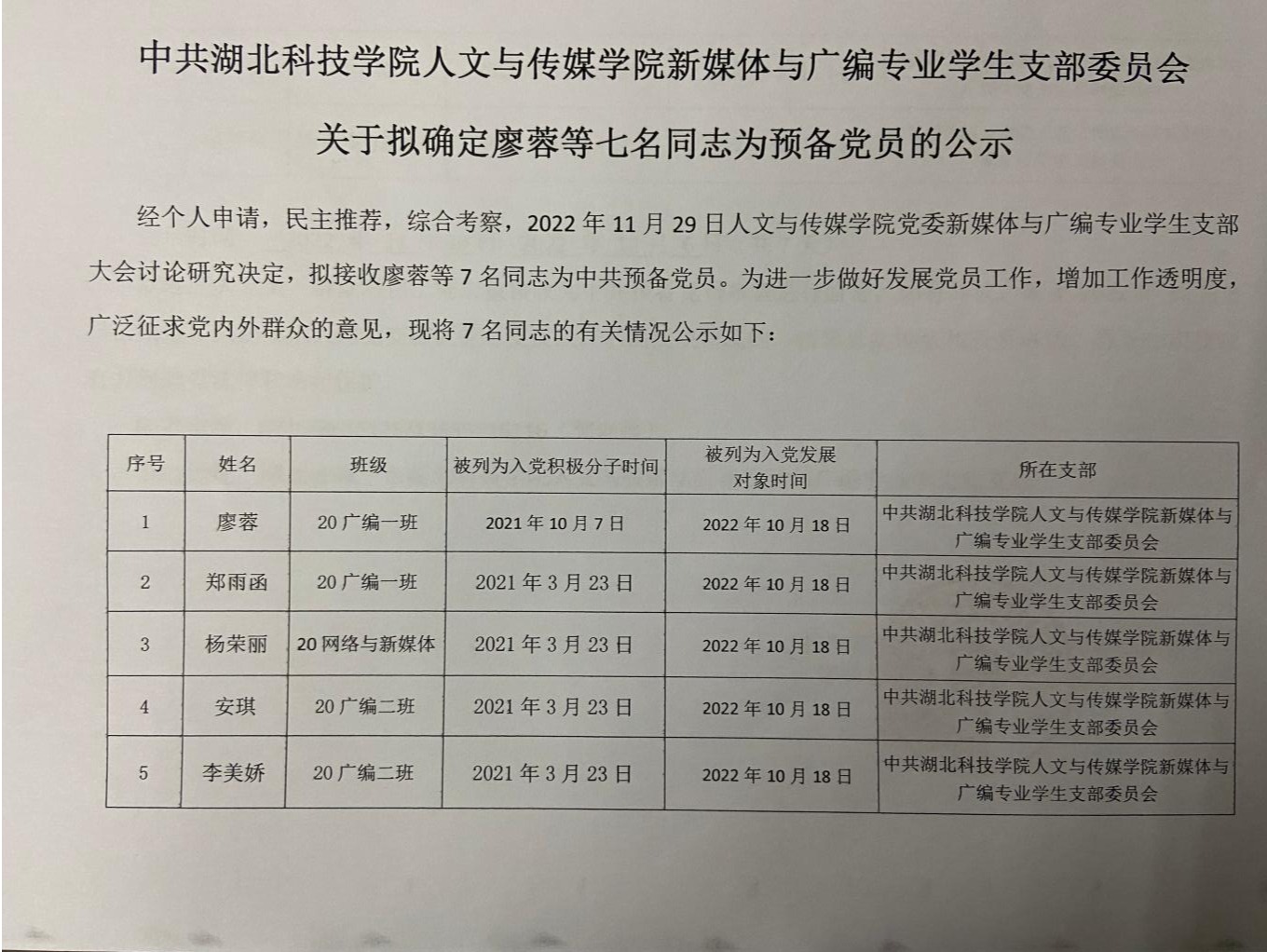 中共william英国中文新媒体与广编专业学生支部委员会关于拟确定廖蓉等七名同志为中共预备党员的公示