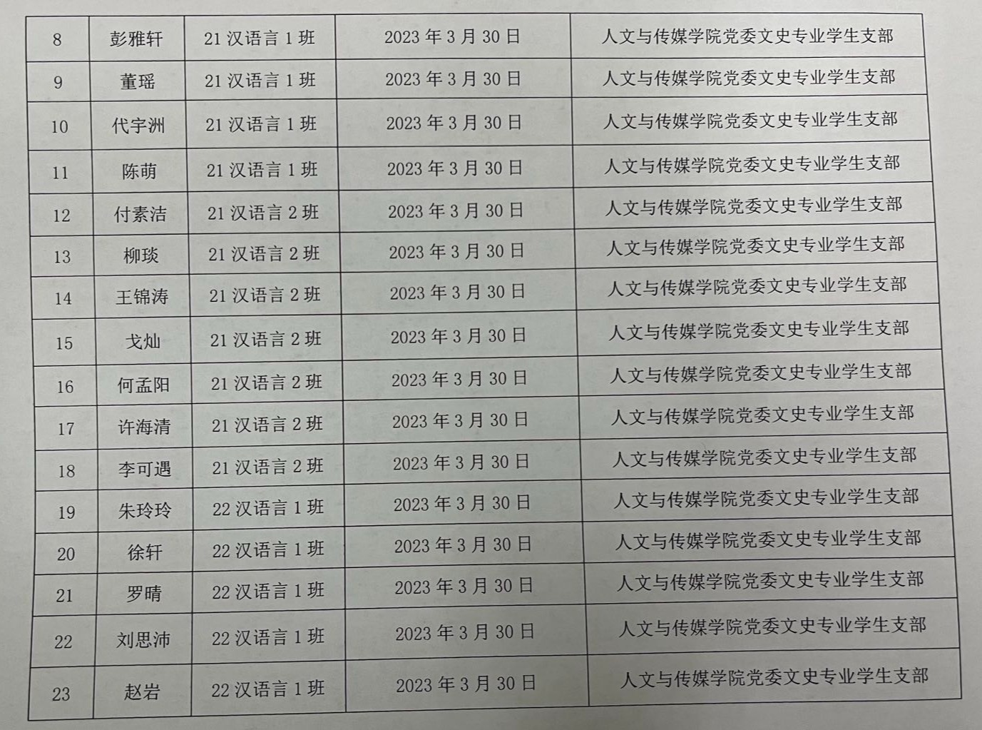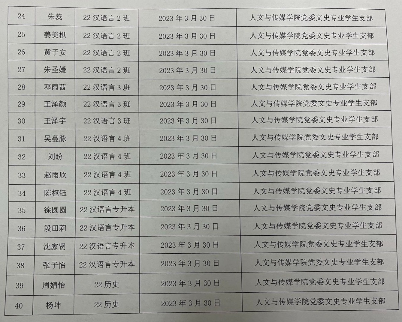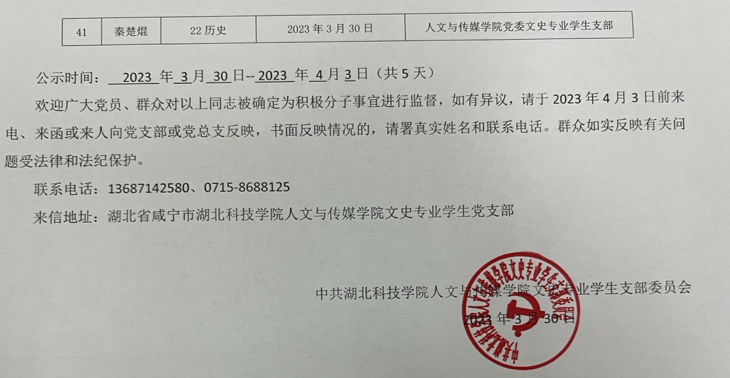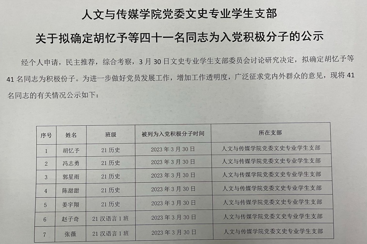 william英国中文党委文史专业学生支部关于拟确定胡忆予等四十一名同志为入党积极分子的公示