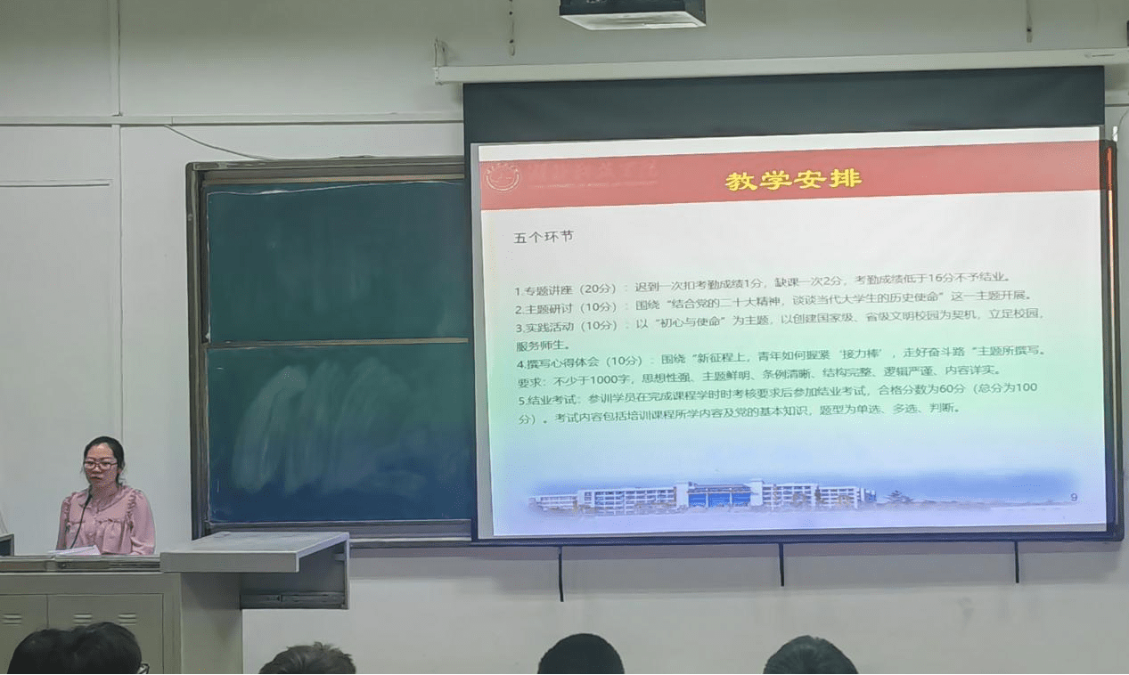本次开班典礼由培训班班主任丁爽老师主持,杨纯新书记发表讲话。杨书记对分党校开班表示衷心的祝贺,向参与党校培训学员表示热烈欢迎。他对参训学员提出三点希望:一是深学百年党史,坚定理想信念;二是校正入党动机,发挥模范作用;三是端正学习态度,保证学有所获。同时也对参训学员提了三点要求,一是坚持集中培训和个人自学相结合,认真完成学习任务,并将知识内化于心、外化于行;二是坚持学习与思考相结合,联系自己的思想实际来作深入的思考,在思想层面上有收获,在灵魂深处有触动;三是坚持理论和实践相结合,将学到的知识运用到生活与工作中,切实提高解决问题的能力。最后,杨书记寄语同学们以思想上升华引领入党的实际行动,争取早日成为一名名副其实的共产主义先锋战士,为中华民族的伟大复兴添砖加瓦,贡献自己的力量。