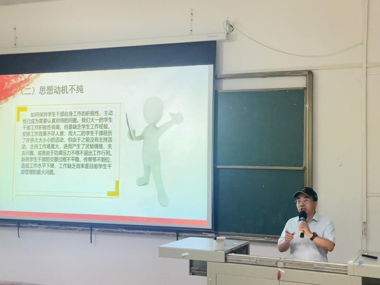 他强调,责任心是开展学生工作的重要前提,学生干部要强化自我教育、自我管理、自我服务、自我监督意识,全心全意为学生服务,怀揣责任心开展学生工作。