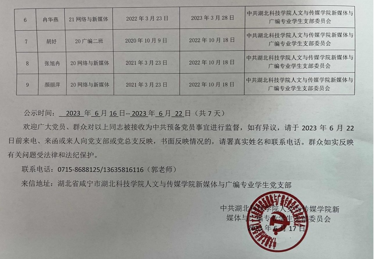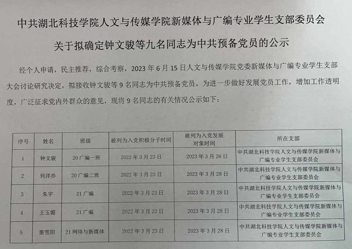 中共william英国中文新媒体与广编专业学生支部委员会关于拟确定钟文骏等九名同志为中共预备党员的公示