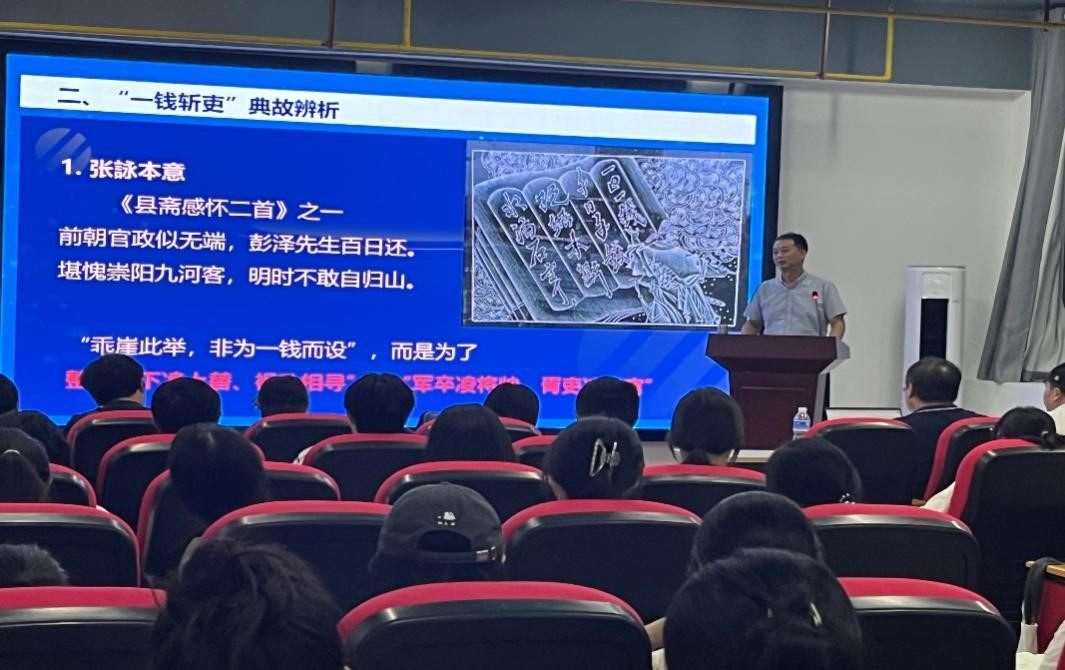 结合习近平总书记关于党风廉政建设的重要论述,熊毅教授深入浅出地讲解了崇阳古人在理想志向、作风建设、党内监督方面的优良传统,号召所有党员继续保持水滴石穿的坚韧精神。并结合文献史事,以崇阳县令张詠为例,介绍了“一钱斩吏”的典故,从“志向高远”“崇本报国”“富民厚生”“崇廉反贪”“举贤黜邪”“淡泊慎独”等六个方面,详细讲述了张詠的廉政思想和严宽并施的治理精神。