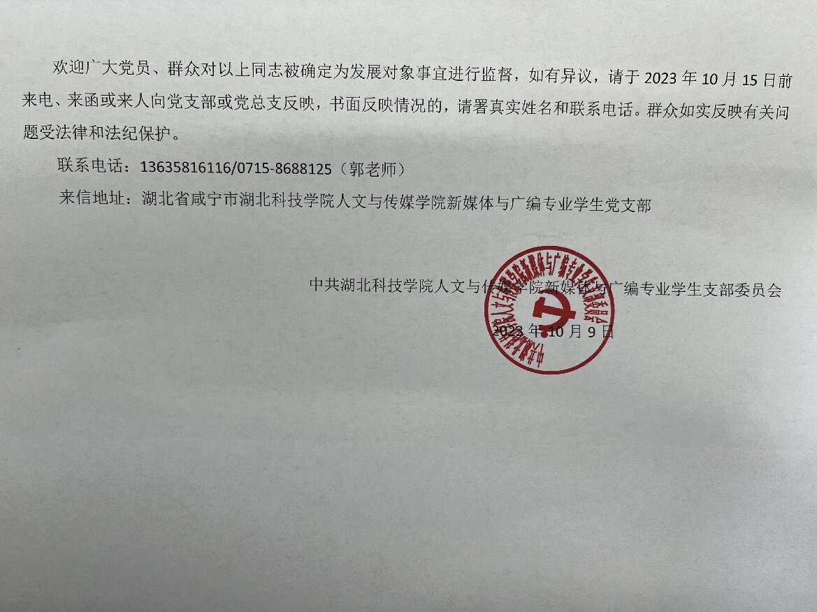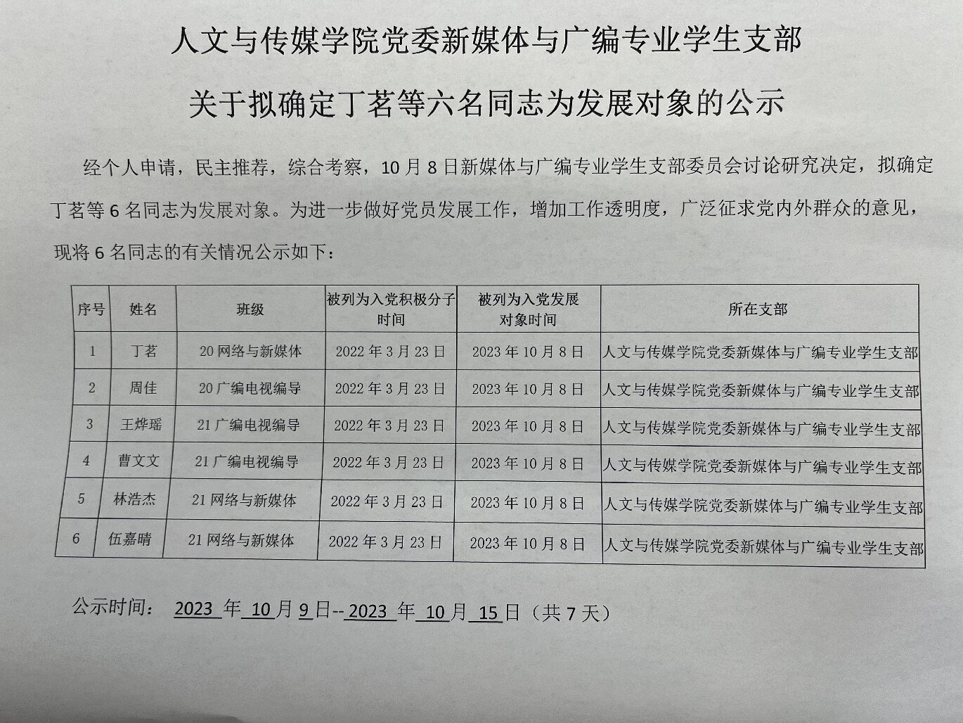 william英国中文党委新媒体与广编专业学生支部关于拟确定丁茗等六名同志为发展对象的公示