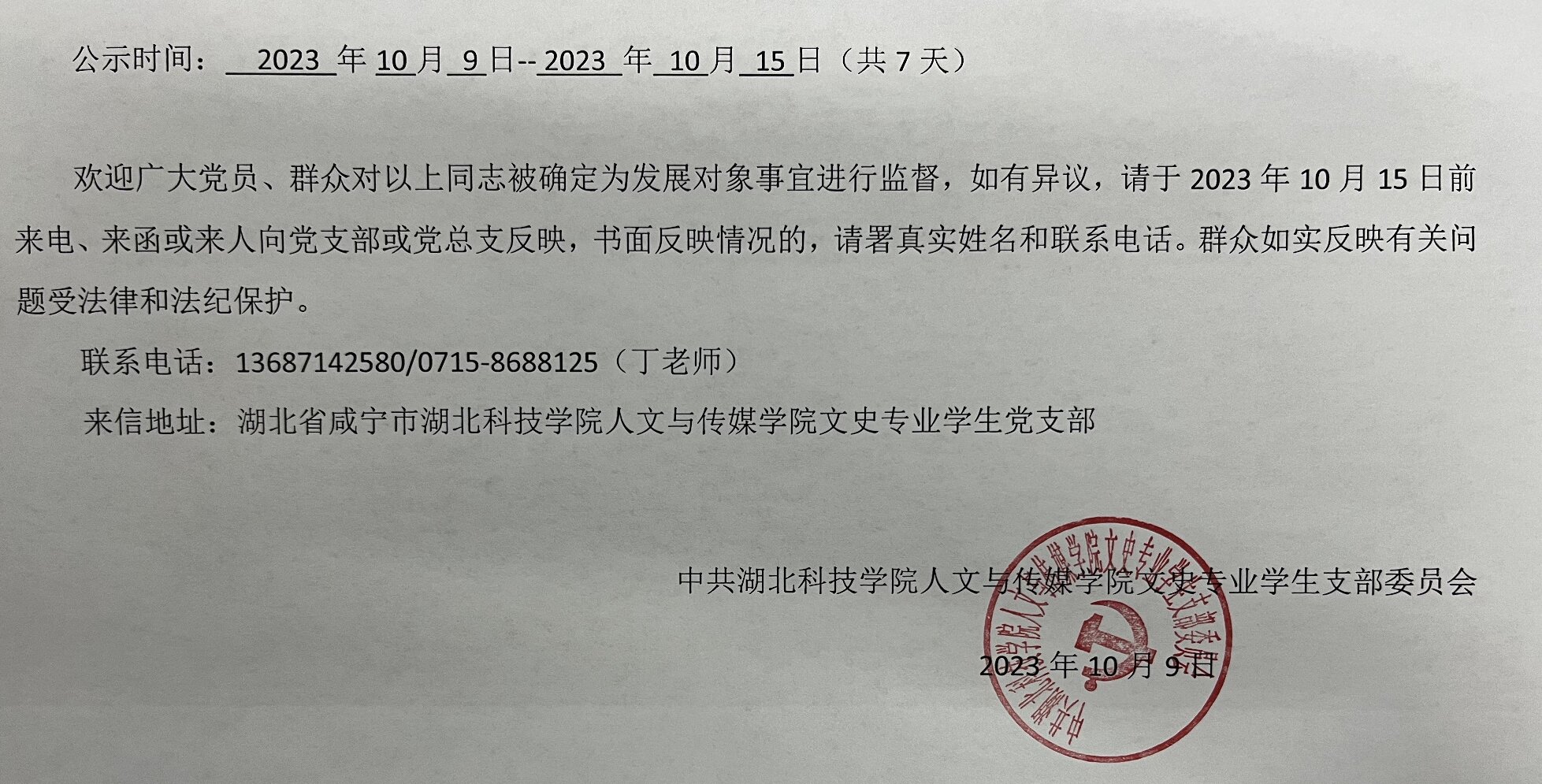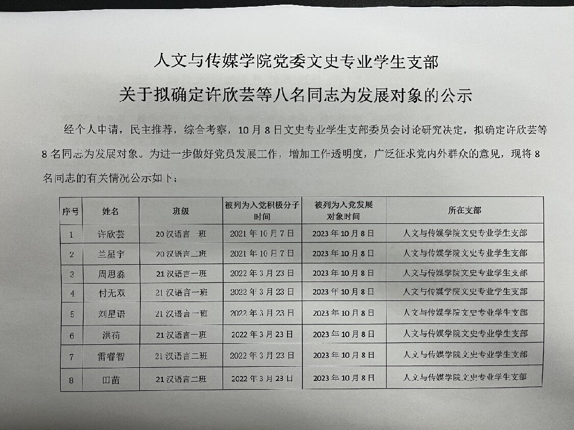 william英国中文党委文史专业学生支部关于拟确定许欣芸等八名同志为发展对象的公示