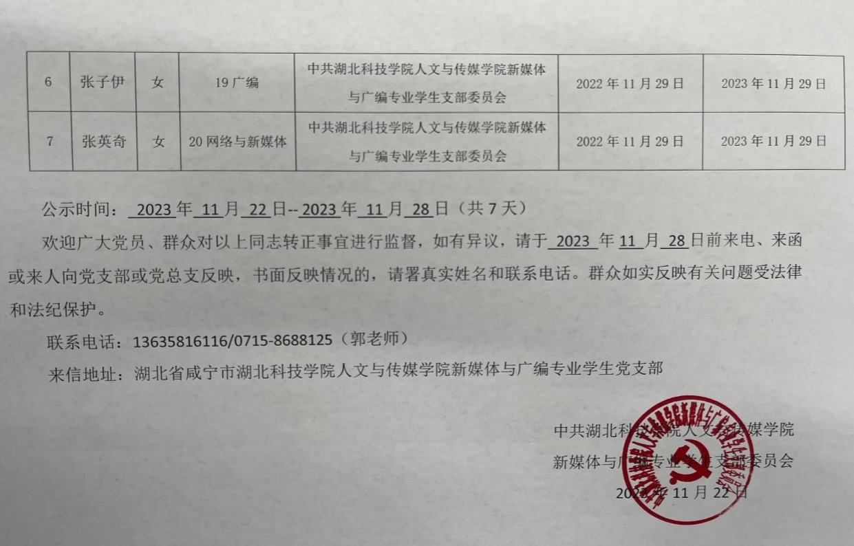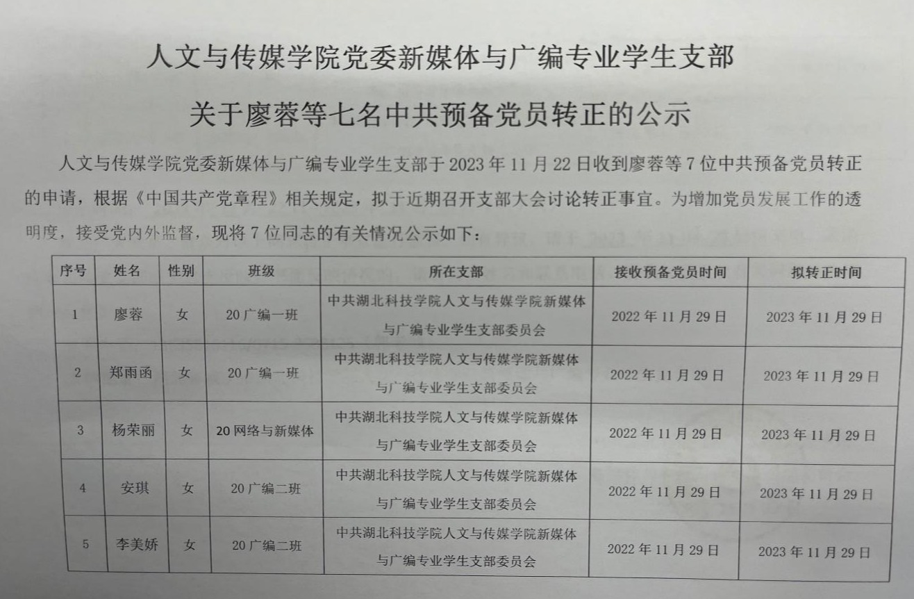 william英国中文党委新媒体与广编专业学生支部关于廖蓉等七名同志中共预备党员转正的公示