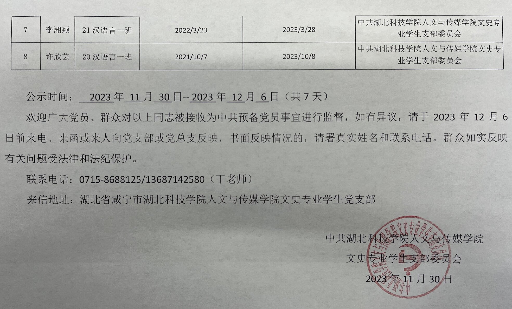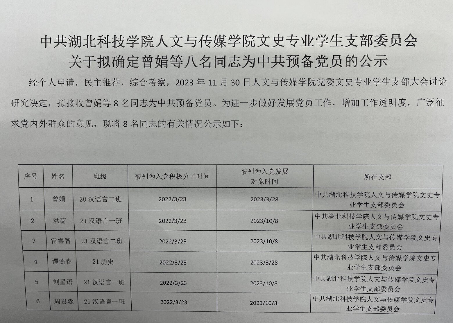 中共william英国中文文史专业学生支部委员会关于拟确定曾娟等八名同志为中共预备党员的公示