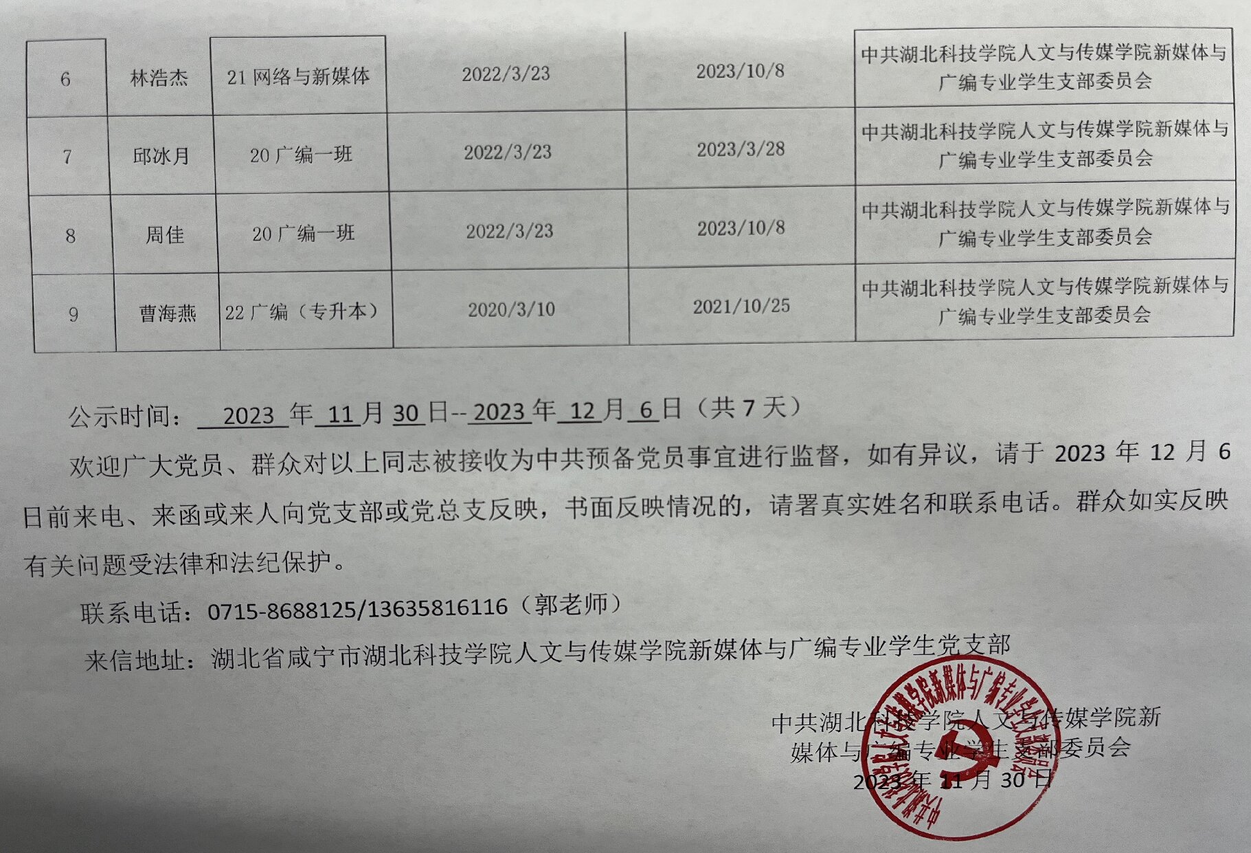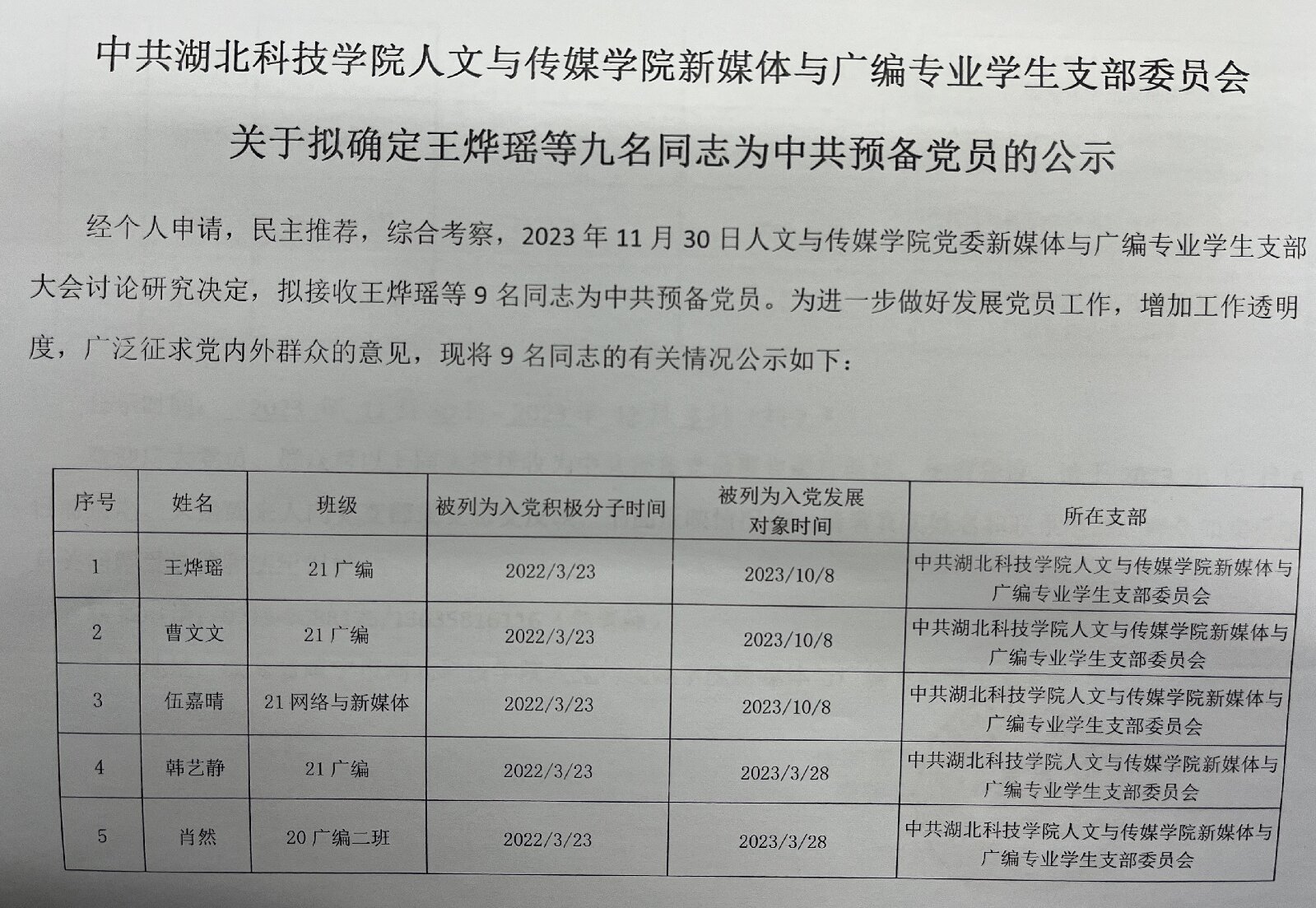 中共william英国中文新媒体与广编专业学生支部委员会关于拟确定王烨瑶等九名同志为中共预备党员的公示