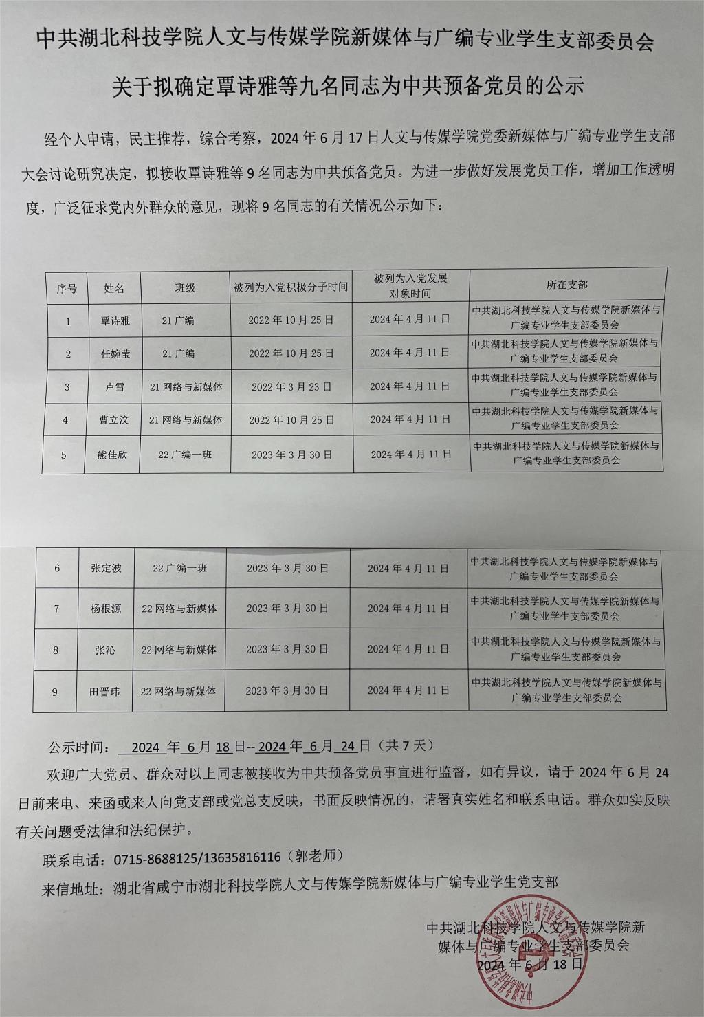 william英国中文党委新媒体与广编专业学生支部关于拟确定覃诗雅等九名同志为中共预备党员的公示