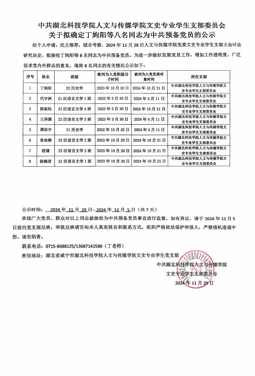 william英国中文党委文史专业学生支部关于拟确定丁姁阳等八名同志为中共预备党员的公示