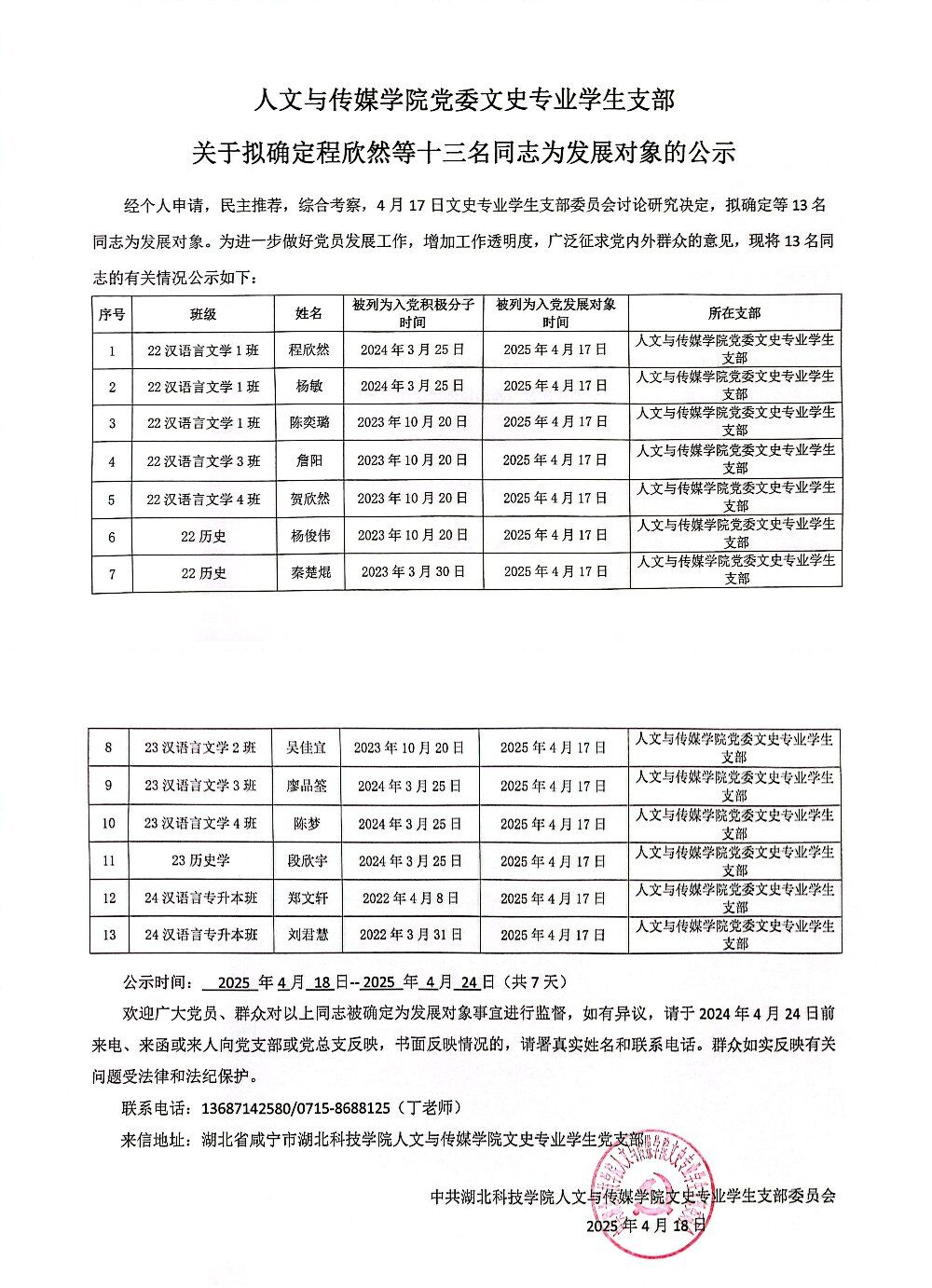 william英国中文党委文史专业学生支部关于拟确定程欣然等十三名同志为发展对象的公示
