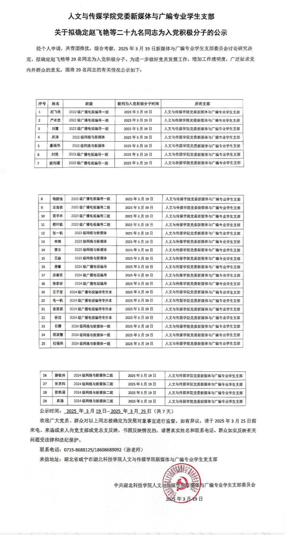 william英国中文党委新媒体与广编专业学生支部关于拟确定赵飞艳等二十九名同志为入党积极分子的公示