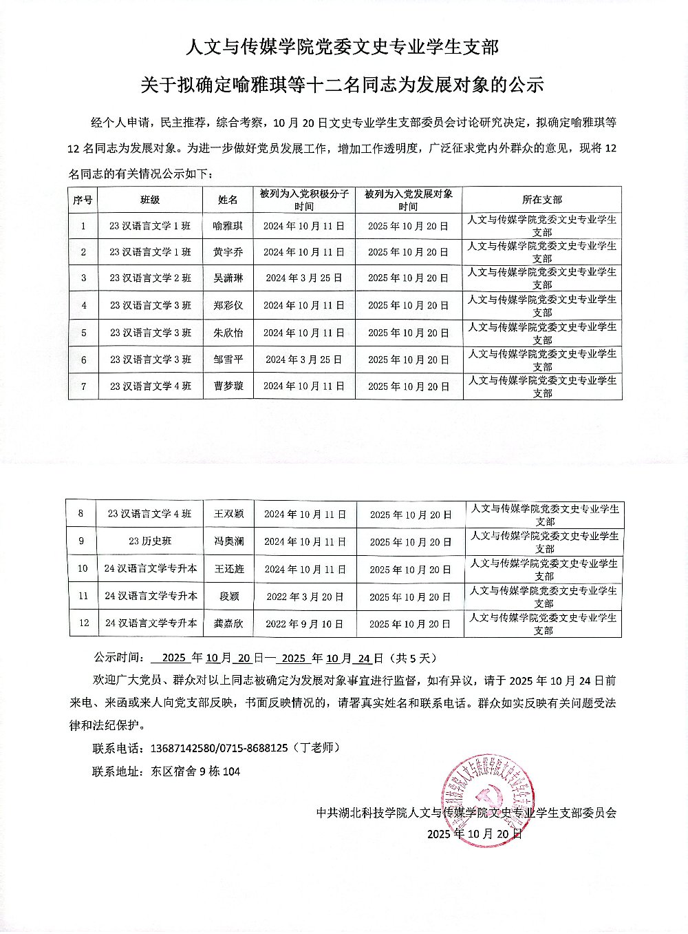 william英国中文党委文史专业学生支部关于拟确定喻雅琪等十二名同志为发展对象的公示