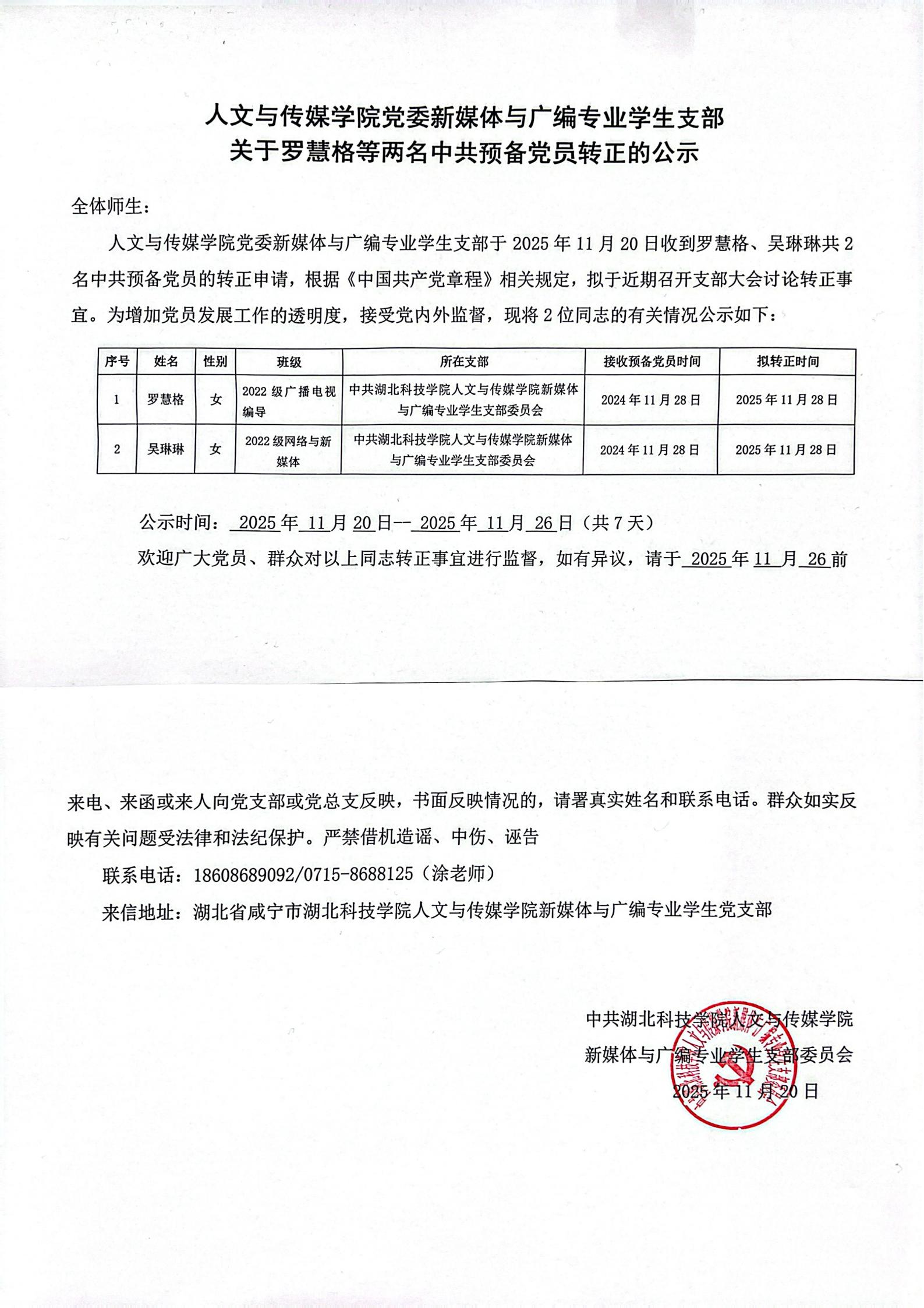 william英国中文党委新媒体与广编专业学生支部关于罗慧格等两名中共预备党员转正的公示