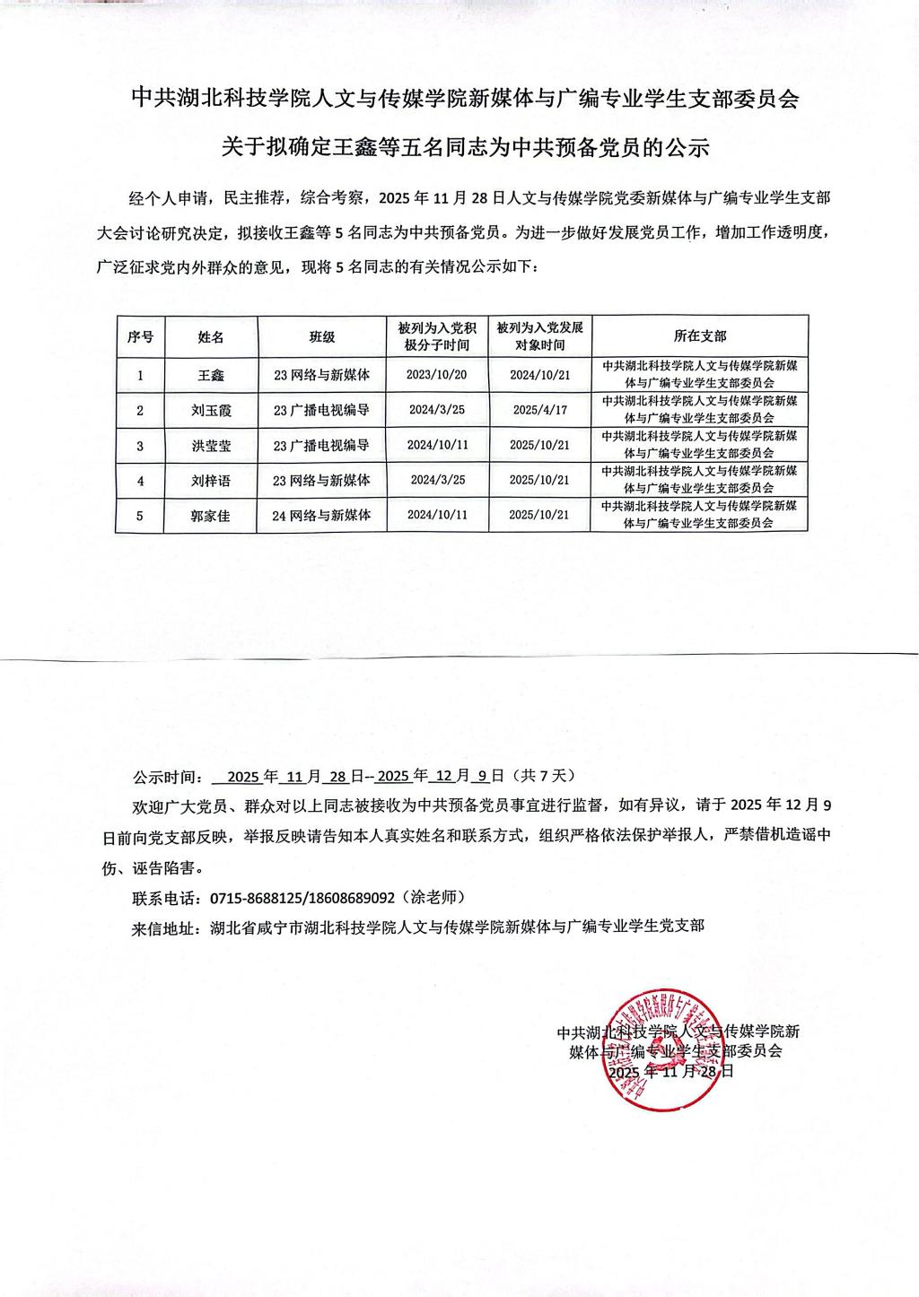 中共william英国中文新媒体与广编专业学生支部委员会关于拟确定王鑫等五名同志为中共预备党员的公示