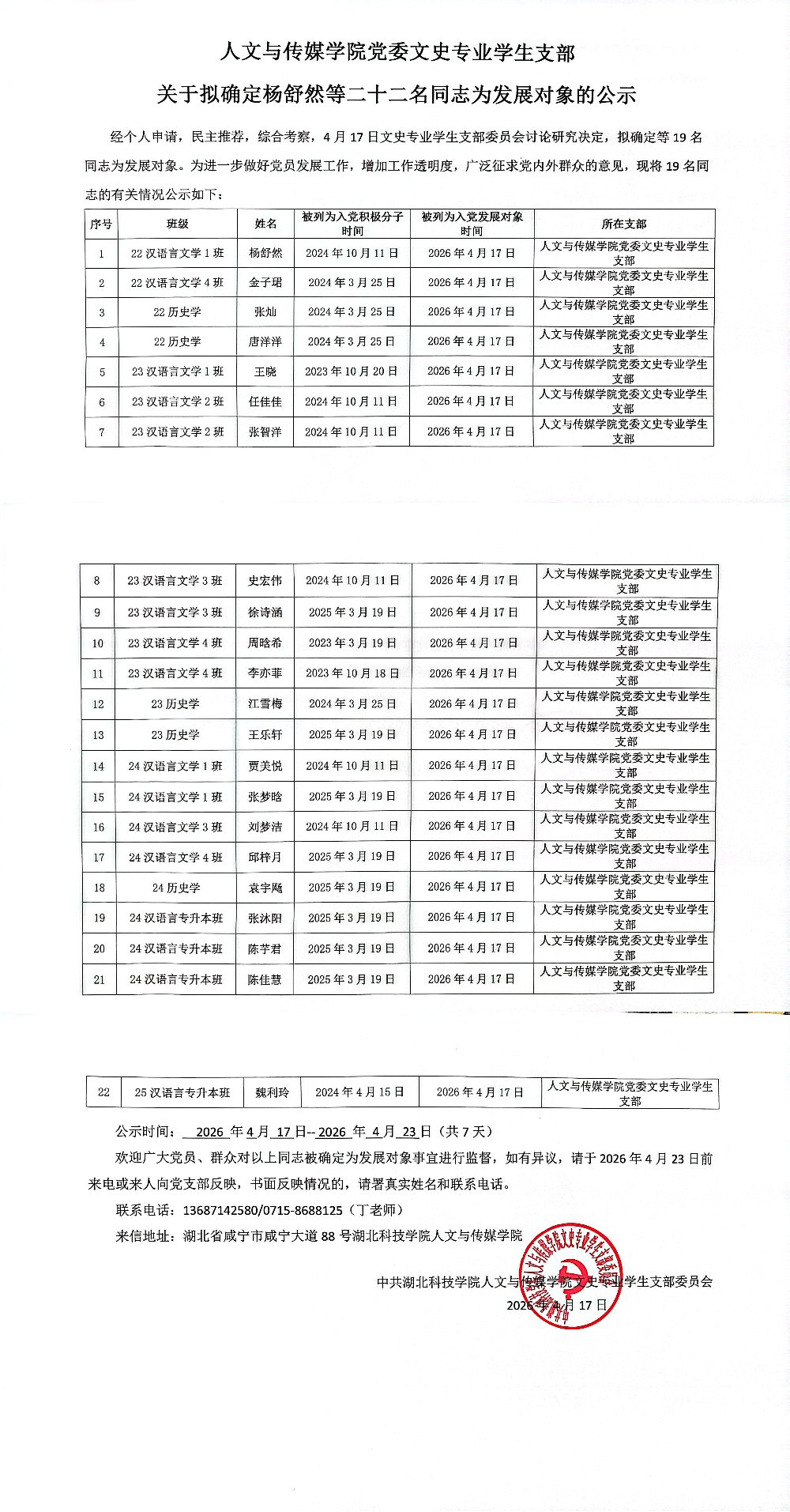 william英国中文党委文史专业学生支部关于拟确定杨舒然等二十二名同志为发展对象的公示