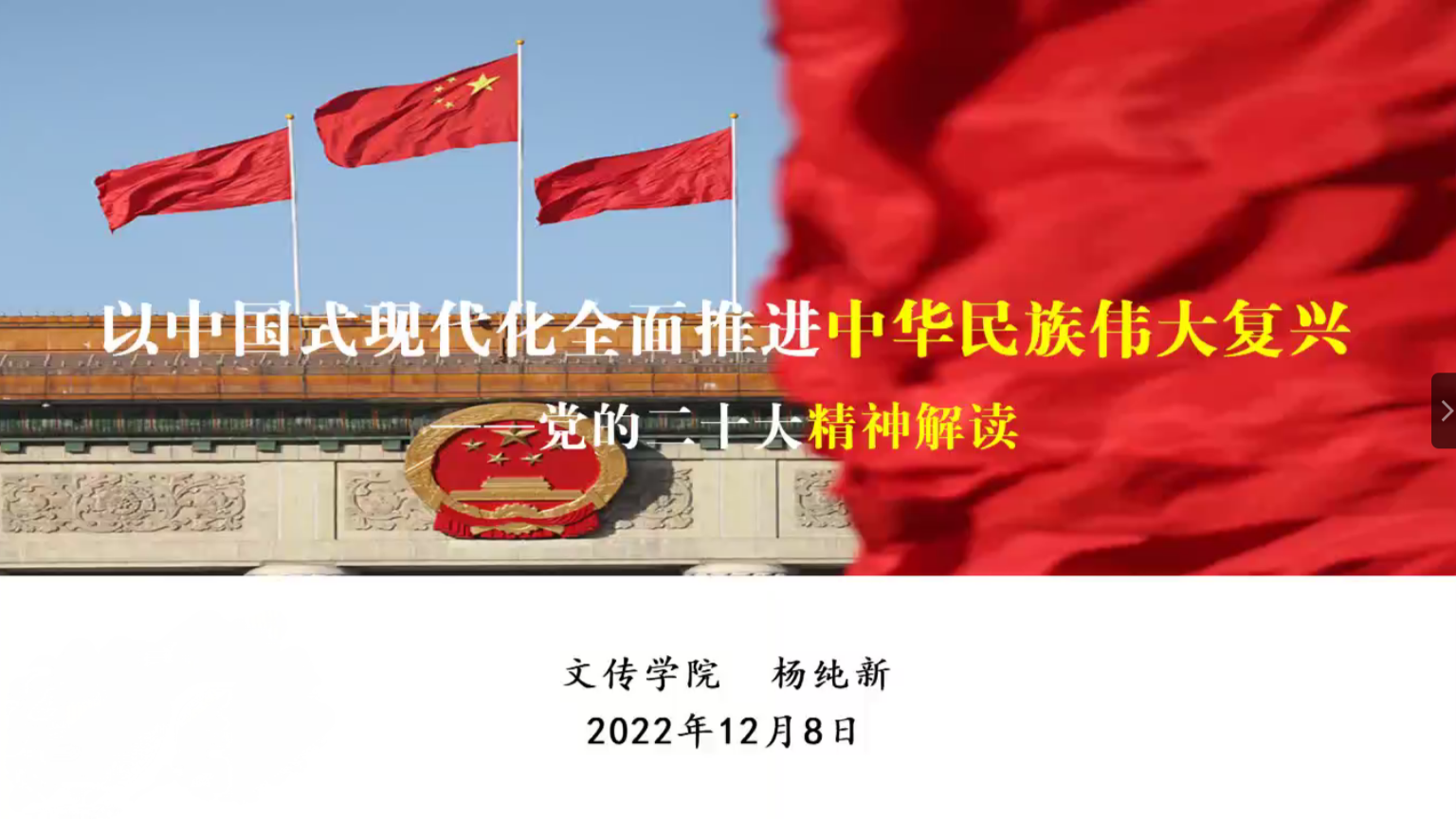为进一步贯彻落实党的二十大精神,12月8日下午,william英国中文开展“党的二十大精神宣讲”视频会议。党委书记杨纯新作了题为《以中国式现代化全面推进中华民族伟大复兴》宣讲报告,学院全体教职工与院“青马工程”第五期培训班全体学员参会。