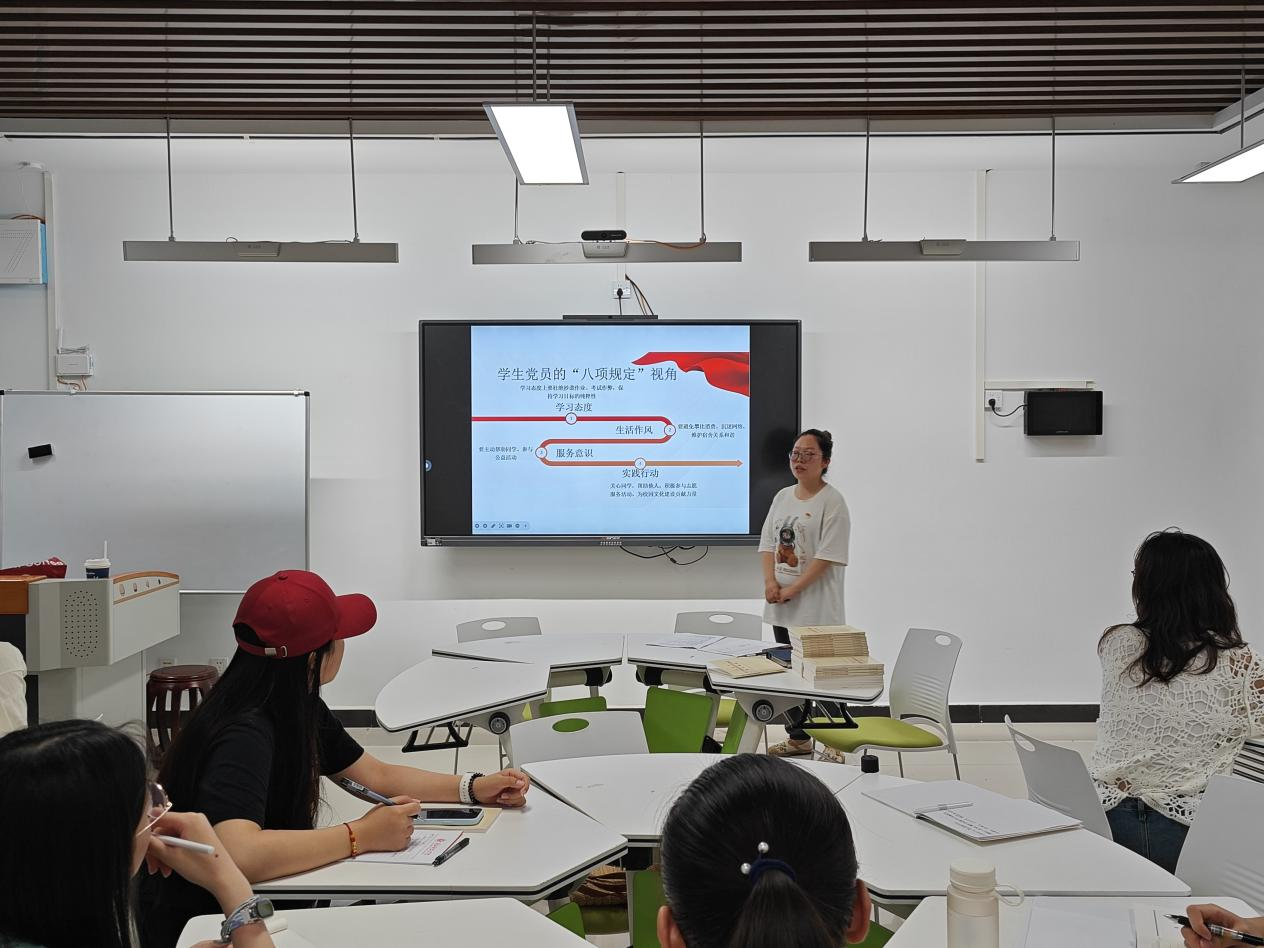 丁爽老师强调:《八项规定》不是高高在上的政策条文,而是我们锤炼党性的行动指南。我们应该从更加实际的层面领会规定精神,强化实践能力,严守作风红线,以党员的身份在今后的学习生活中积极进取,挺膺担当,做到自觉严守纪律、自觉服务同学、自觉勇担使命,争做新时代先锋表率。