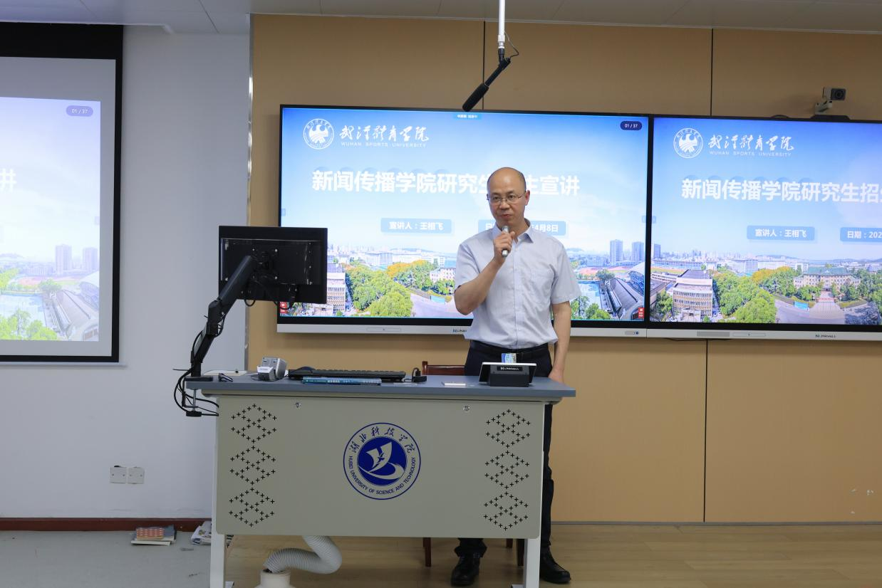 武汉体育学院新闻传播学院院长王相飞教授(博士生导师)代表团队发言,强调“选择对个人发展至关重要”。他表示,学院将通过跨学科课程设计、实践导向的培养模式,助力学生适应社会需求。随后,研究生教学办公室主任吕永峰老师作专题报告,详细解析硕士专业选择策略、学术研究方法及职业发展路径,并结合案例分享如何将体育与新闻传播学科交叉融合,开拓创新研究方向。