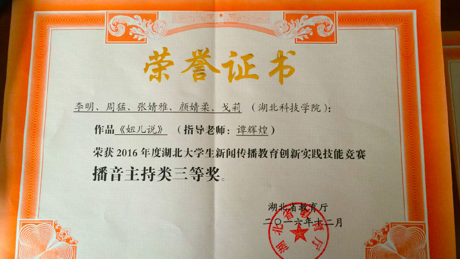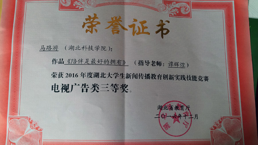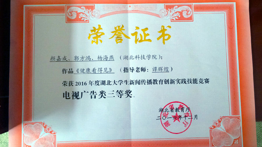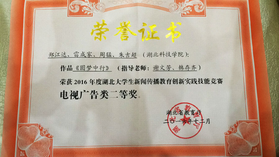 此次竞赛由湖北省高等教育学会新闻与传播教育专业委员会组织评审委员会对各高校参评的2016年湖北大学生新闻传播教育创新实践技能竞赛作品进行评审,从全省28所本专科高校参评的239部大学生新闻传播教育创新实践技能竞赛作品中评审出一等奖16项,二等奖30项,三等奖57项。比赛决出电视广告类、播音主持类等奖项,我院广播电视编导专业学生郑江达、雷成家、周猛、朱吉超创作的作品《圆梦中行》,获得电视广告类二等奖;由颜嘉成、郭方鸿、杨海艳创作的作品《健康看得见》和马路游创作的作品《陪伴是最好的拥有》,获得电视广告类三等奖;由李明、周猛、张婧雅、颜婧柔、戈莉制作的作品《妞儿说》,获得播音主持类三等奖。我校学生代表周猛、颜嘉成参会并代表获奖同学领取获奖证书。