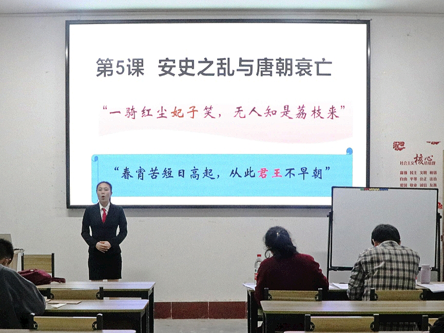 在即席演讲环节,初中组选手抽到“比较开元盛世与贞观之治”和教师如何处理课堂突发情况两个问题;高中组选手则抽到“解释《租借法案》”和教师如何对学生进行德育等问题。各组选手在短暂的准备后,调动历史专业知识和教育学相关知识进行回答。不难发现,讲演题目的设计别出心裁,涉及的历史学相关题目与选手备课内容联系紧密。