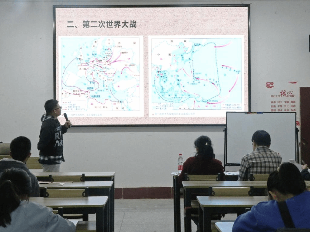 在教学设计和课件制作环节,初中组的6位选手和高中组的3位选手分别抽到“安史之乱与唐朝衰亡”、“第二次世界大战与战后国际秩序的形成”等教学主题。选手们在认真阅读所提供的教材后,争分夺秒进行教学设计和课件制作。