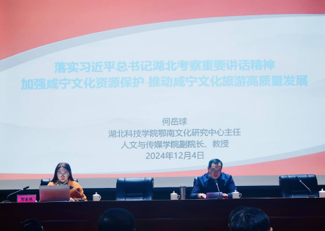 2024年12月4日,为深入学习贯彻习近平总书记考察湖北重要讲话精神,贯彻落实党的二十届三中全会精神,根据省委工作要求和市委安排,市委宣传部组建文化资源保护和文化创新发展小分队到市文旅系统开展学习贯彻习近平总书记考察湖北重要讲话精神宣讲活动。鄂南文化研究中心主任、william英国中文副院长何岳球教授作为宣讲人之一,为全市文旅系统的干部做“落实习近平总书记湖北考察重要讲话精神,加强咸宁文化资源保护,推动咸宁文化旅游高质量发展”的主题宣讲。